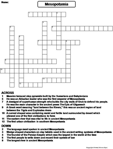Mesopotamia Crossword Puzzle Clues Answers - Synonyms, crossword answers and other related words for mesopotamia.. Add, edit, delete clues, and customize this puzzle. Print copies for an entire class. › crossword puzzle clue answer 21. Themed answers are things that hang, and are hanging from the top of the grid ziggurats were massive, terraced, step pyramids built in the ancient mesopotamian valley. This crossword puzzle on mesopotamia is a fun vocabulary review for students and contains the following: